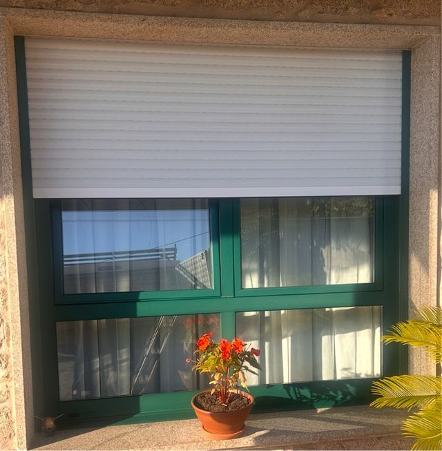Conjunto de ventanas rotura de puente térmico, cristal climalit - Marco de aluminio color verde. - Persianas enrollables blancas de aluminio
