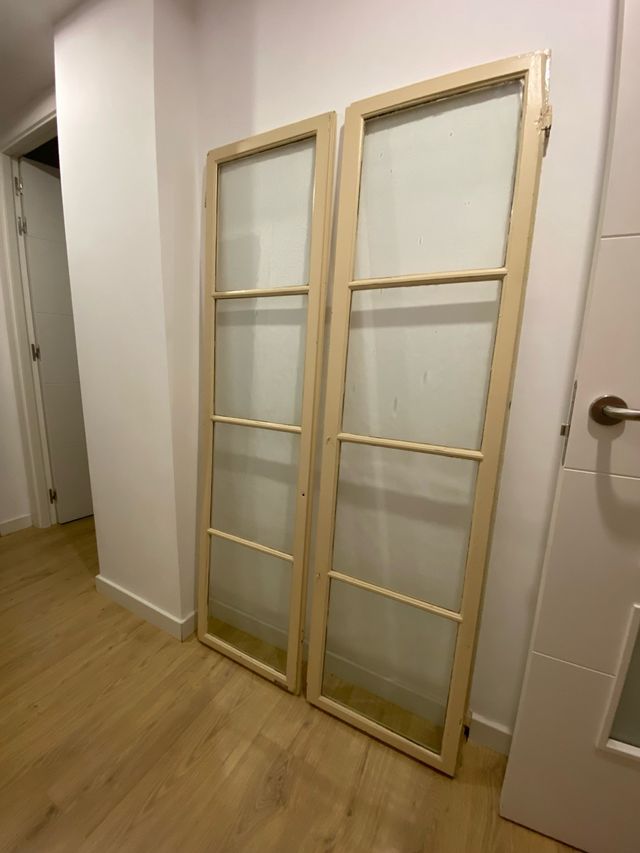Detalles del productoDos ventanas antiguas de madera con divisiones de cristal.