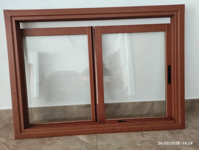 Detalles del productoSe venden ventanas de aluminio correderas con acabado en color madera.