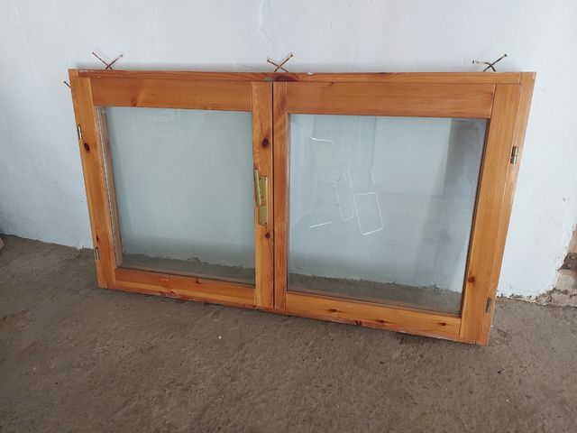 2 ventanas de madera, la grande con cristal climalit y la pequeña con cristal traslúcido de medidas 139 x 80 y 96 x 74 cm. Grande: 100 €. Pequeña: 50 €.
