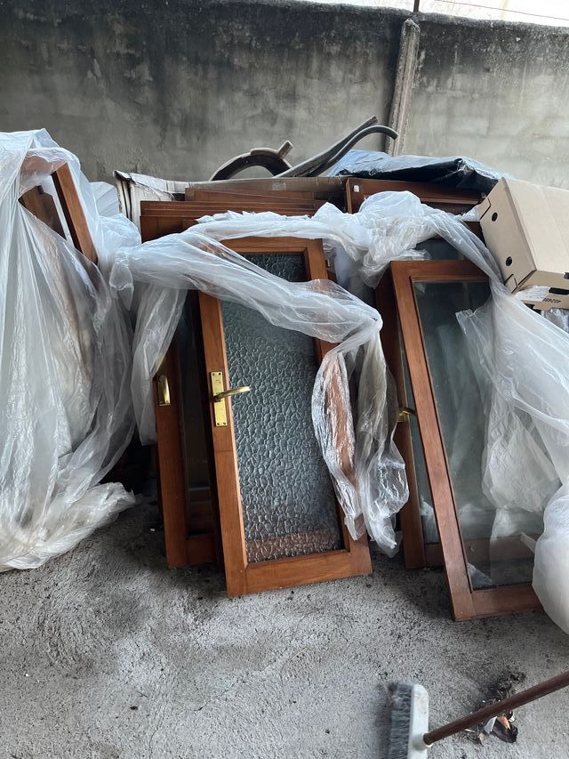 Detalles del productoPuertas y ventanas de madera en buen estado.Ideales para restaurar o reutilizar en proyectos de bricolaje.