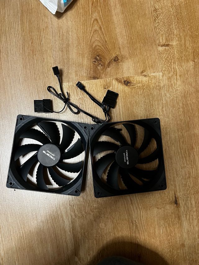 Dos ventiladores negros para PC de la marca Tacens. - Diseño de aspas optimizado. - Conectores estándar para alimentación y control.