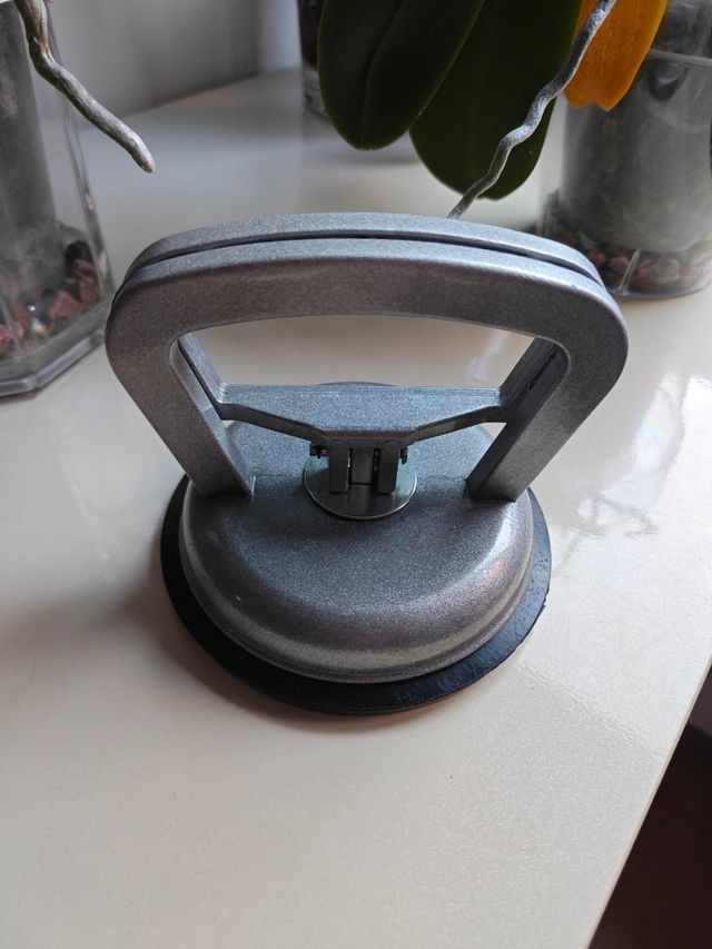 Ventosa de succión para mover cristales o superficies lisas. Es robusta y fácil de usar. - Color gris metalizado. - Mango ergonómico. - 11,5 cm de diámetro. Nueva a estrenar.