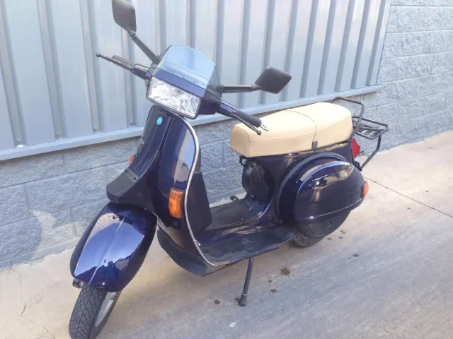 Detalles del productoScooter Vespa TX 209 de color azul oscuro, con asiento beige y parabrisas.