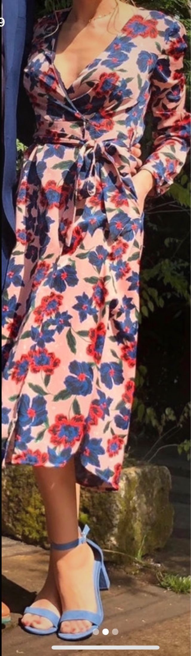 Vestido floral, cierre con lazo y abertura lateral. Talla algo grande.