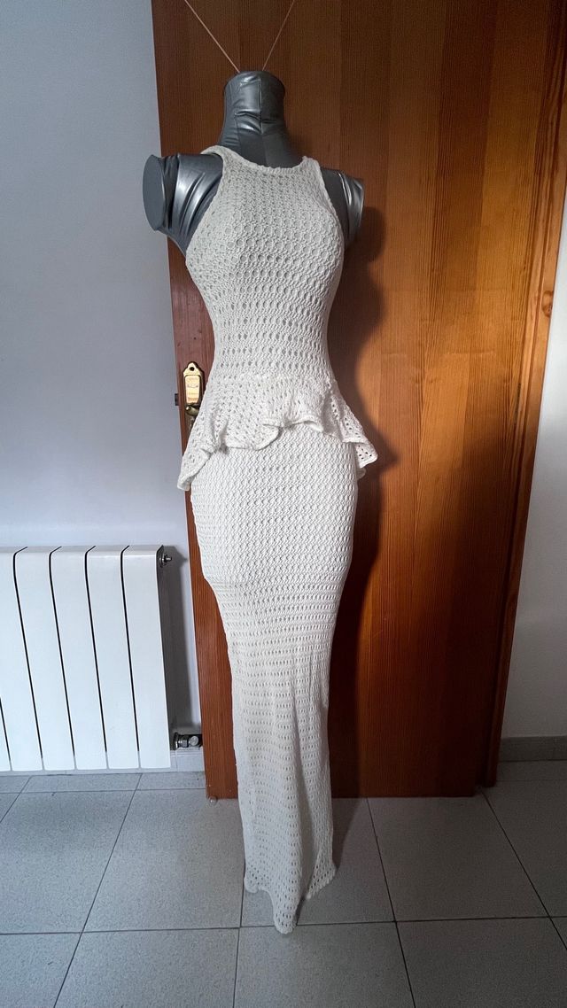 Precioso vestido elástico de crochet y forro interior blancos. Top nadadora, péplum, corte trasero en la falda y largo por la pantorrilla o tobillo.