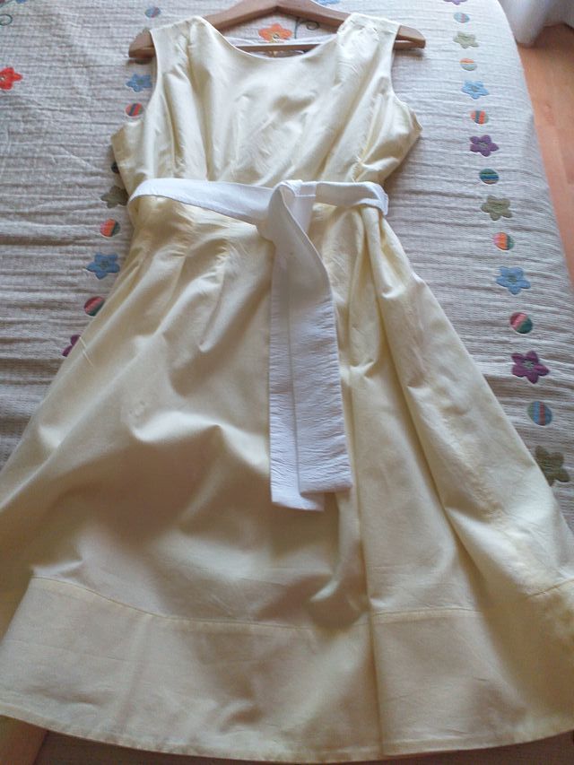 Precioso vestido de algodón amarillo claro, forrado en blanco. Entallado a la cintura y con vuelo. Se complementa con un cinturón de tela blanco que se puede atar delante o detrás. Da poca talla. Usado solo una vez Medidas y composición: algodón. Largo: 96 cm, 40 cm de cintura (de costura a costura), 48 cm de sisa a sisa