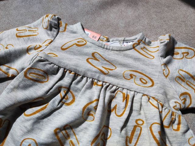 Vestido de manga larga, 57% algodón, 38% poliéster. Color gris clarito y letras en mostaza. Talla 3-6 meses ó 68 cm. Nuevo, sin estrenar, con etiqueta.