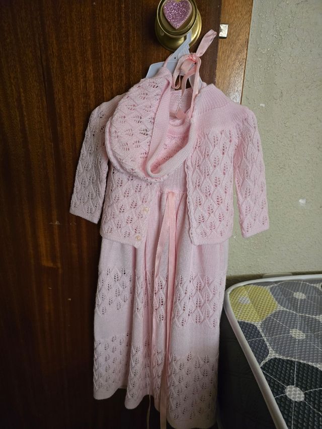 Detalles del productoPrecioso vestido de bebé de color rosa, con un diseño de punto delicado. Es ideal para ocasiones especiales.