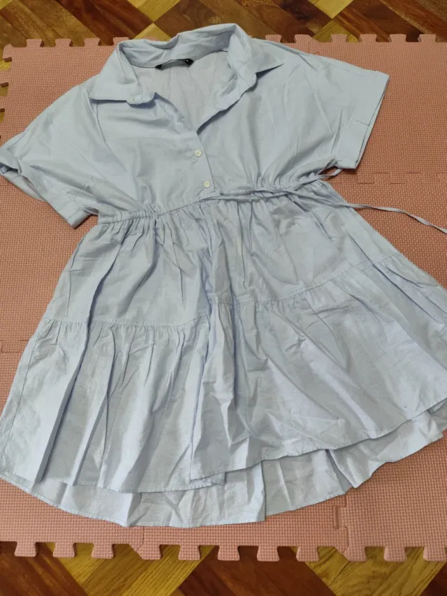 Vestido camisero de manga corta con un diseño moderno y favorecedor. La cintura elástica y la falda con volantes le dan un toque femenino.