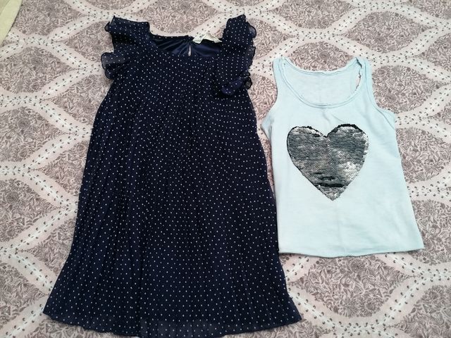 Detalles del productoDos prendas verano por 5€. Vestido sin mangas de h&m, azul marido con lunares pequeñitos blancos, tela plisada, volantes en las mangas, otra tela interior. Como nuevo. Y también camiseta tirantes natación con corazón de lentejuelas cambiantes de color. Talla 4,5 años.