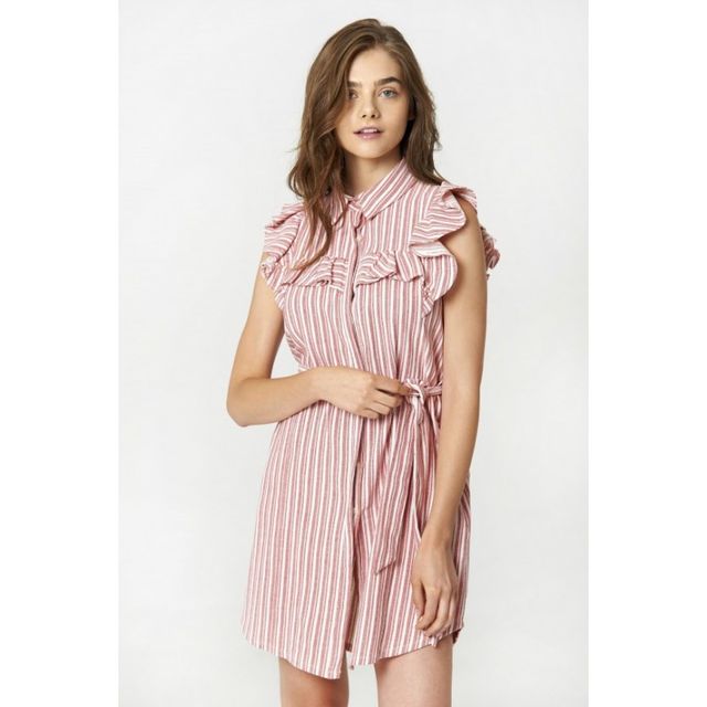 Detalles del productoVestido camisero a rayas abierto por delante con botones, cinturón del mismo tejido, adorno con volantes en hombros y pecho, talla L, precio original: 79,95€. Laboutiquedemency.es