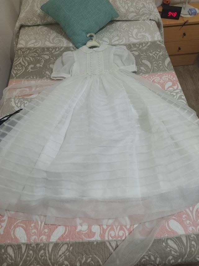 Precioso vestido de comunión para niña, impecable. Ideal para una ocasión especial. - Color blanco. - Talla (a determinar). - Incluye velo.