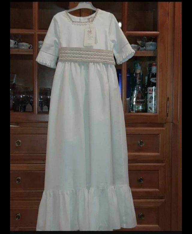 Detalles del productoPrecioso vestido de comunión de la marca Tizzas del Corte inglés.Talla 110.medidas de sisa 34 y de largo 110 cm.La tela del cuerpo lleva dibujo xomo se ve wn las fotos,media manga.En el cuello puntilla a juego con el cinturón. Lleva un volante abajo y su forro.Es muy elegante y sencillo a la vez.Con etiqueta.