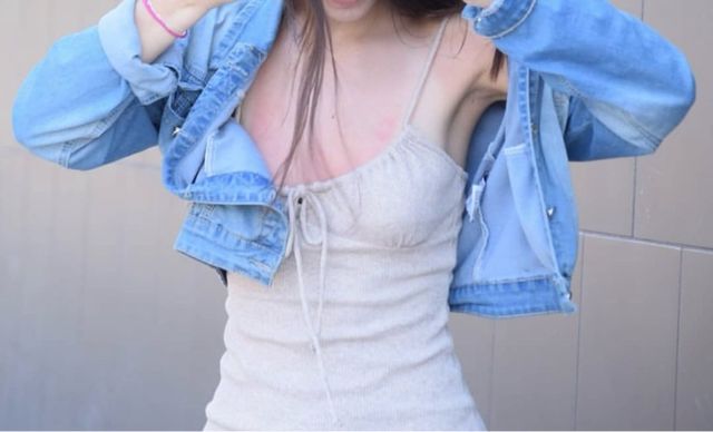 Vestido corto beige con chaqueta vaquera
