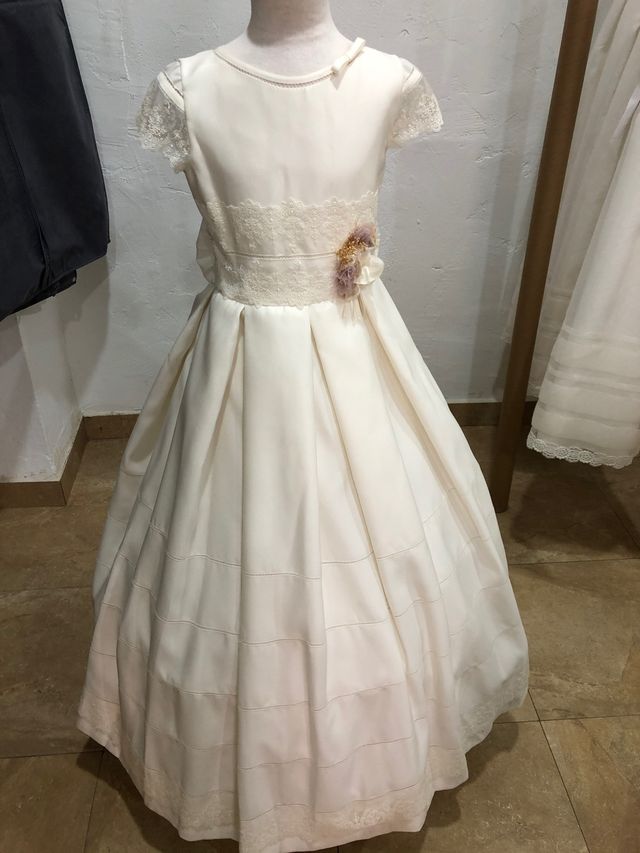 Detalles del productoVestido de colección. Muestrario a estrenar. Vestido confeccionado en tela rústica, falda de tablas con pata de mosca y acabada en puntilla, fajín con doble puntilla y pata de mosca, pomo, cuello redondo con pata de mosca y lacito, manga corta con pata de mosca y puntilla. Talla 10. Cancán no incluido.