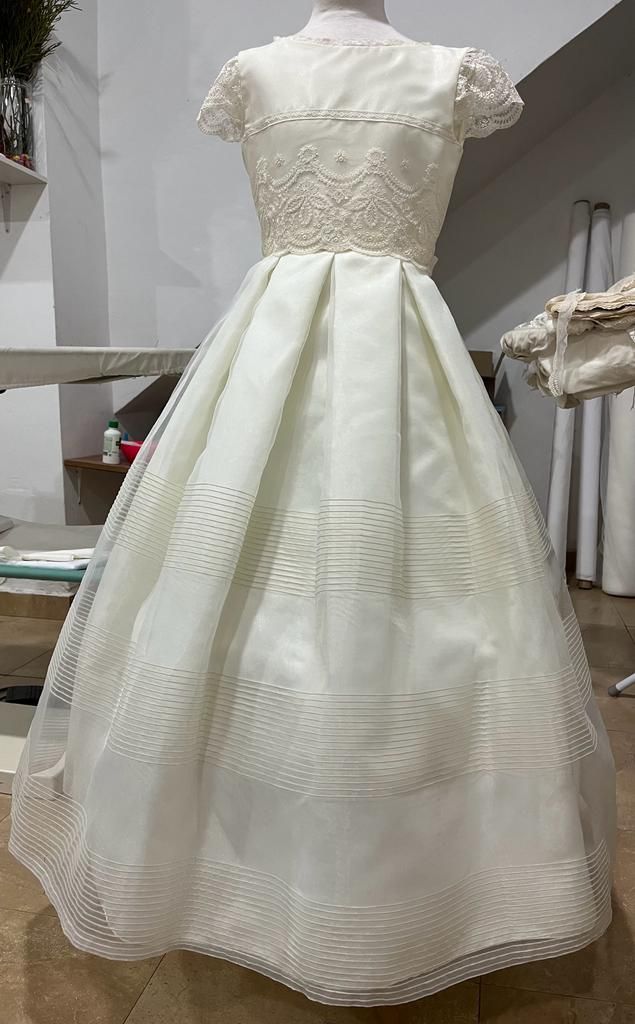 Detalles del productoSe vende vestido de comunión de seda italiana color marfil, falda de tablas con juego de nervios, cuerpo bordado, manga corta bordada, cuello de barco acabado en puntilla. Lazo detrás.