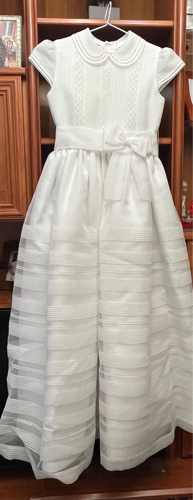 Talla 120. Se encuentra en buen estado aunque tiene unas manchas de estar guardado. El bajo está sucio del roce. Habría que llevarlo al tinte (adjunto fotos).