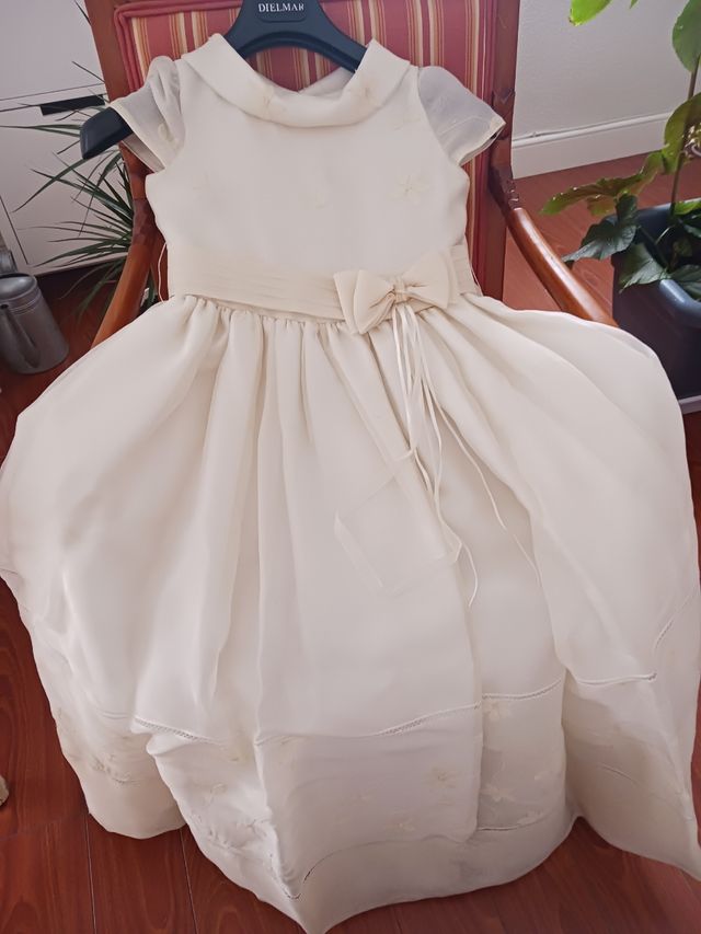 Detalles del productoVestido de Comunión para niña. Color champagne. Realizado de forma artesanal. Las flores, que son muy discretas están cosidas a mano.