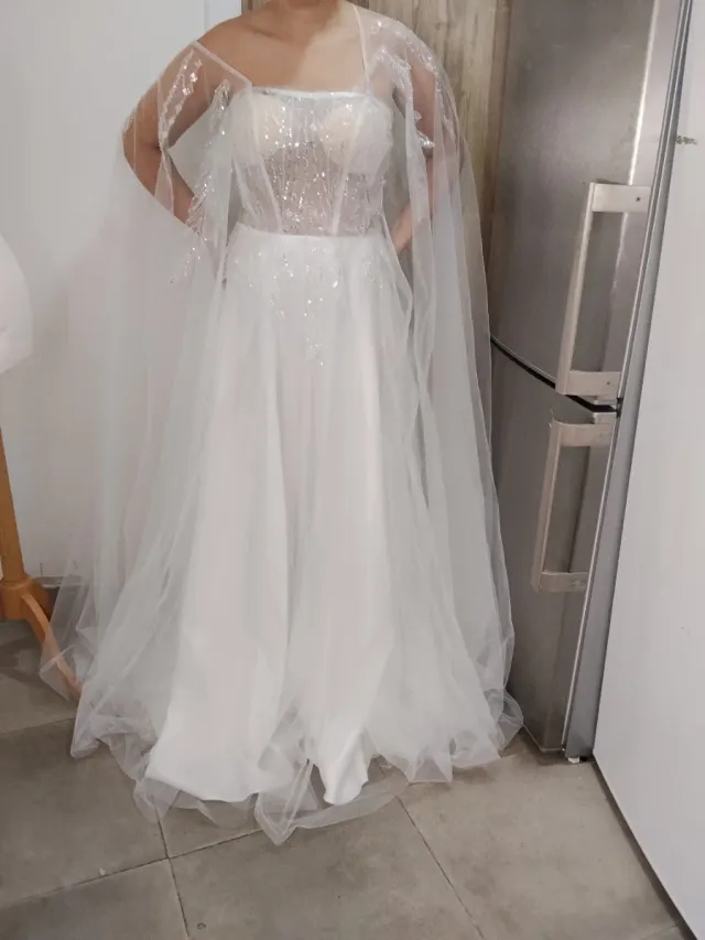 Elegante vestido de fiesta en color blanco, con un diseño único y detalles brillantes.