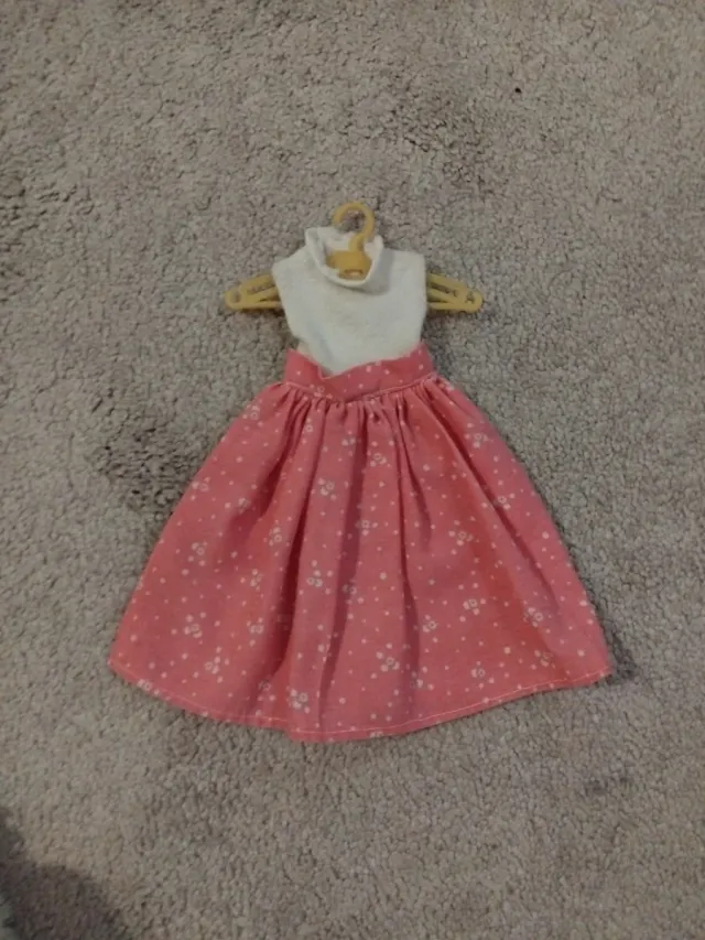 Vestido de muñeca con estampado floral. - Parte superior blanca de cuello alto. - Falda rosa con estampado de flores blancas.