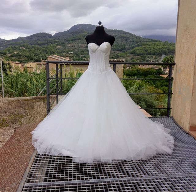Detalles del productoVestido de novia modelo 584, Talla 32 de la firma Demetrios. Presentamos este bonito vestido estilo princesa color blanco, con un corpiño de tejido de poliéster con capa de purpurina, abrochado con cremallera. Sin tirantes y con escote corazón. Cortado en cintura y seguido de una voluminosa falda con capas superpuestas de tul hasta formar la cola. La tercera capa es de tul brillante. Nuevo a estrenar. Buen estado.