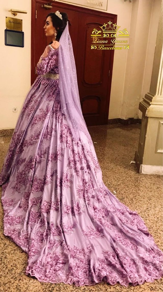 Vestido de novia lila con velo