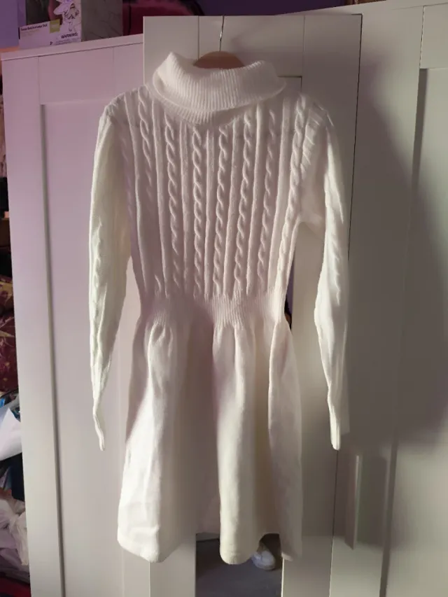 Vestido de punto con cuello alto y manga larga. Diseño con trenzas en el torso y falda acampanada.