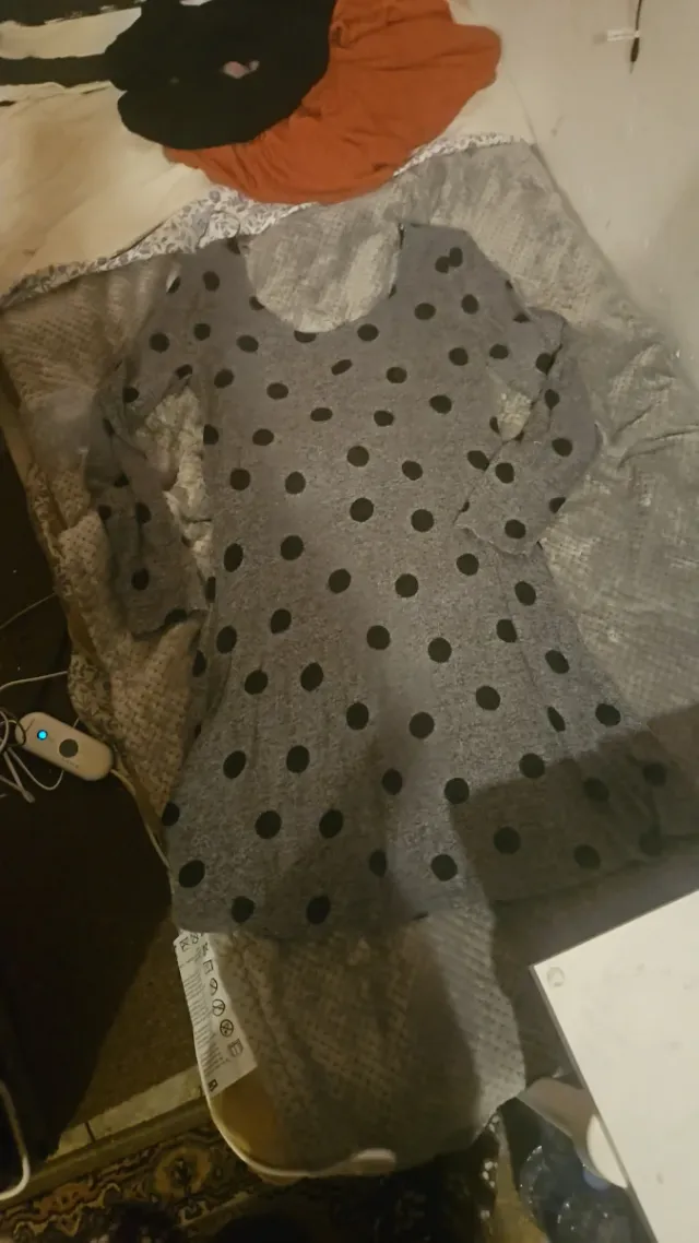 - Diseño de cuello redondo. - Estampado de lunares negros sobre fondo gris. T-M