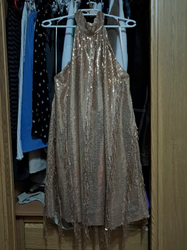 Vestido dorado lentejuelas flecos, estilo vintage