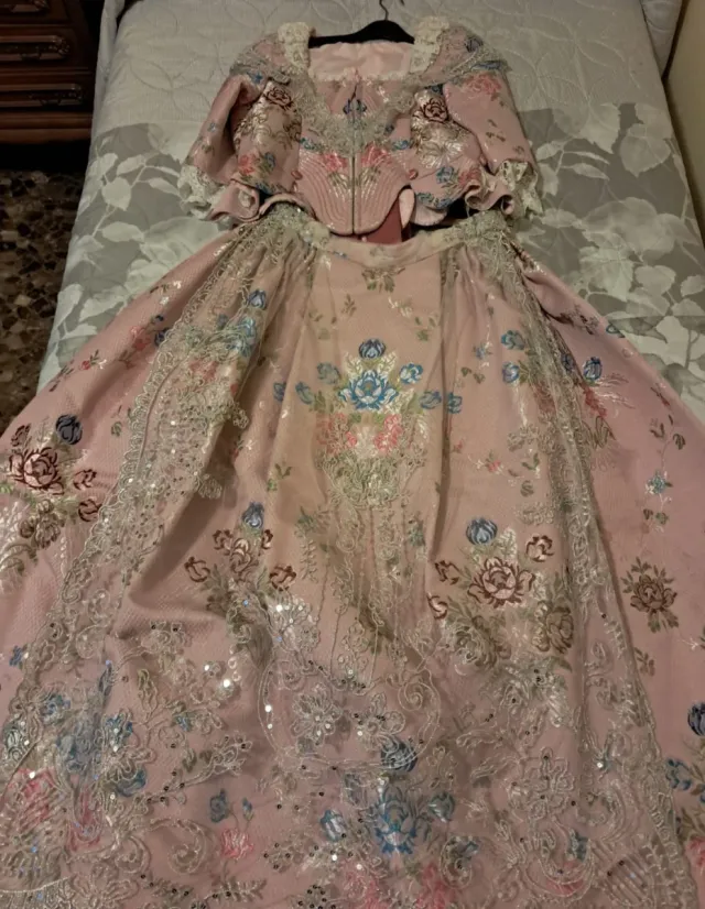 Vestido de fallera con diseño floral y detalles de pedrería.