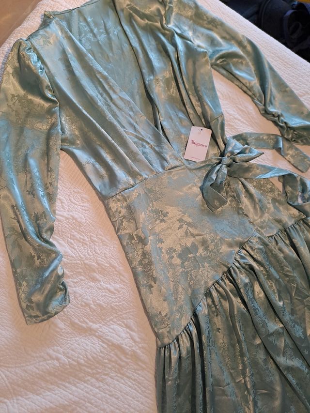 Nuevo con etiqueta. Tela de raso suave verde agua. Detalle de puños fruncidos. Talla única que equivale a una M.