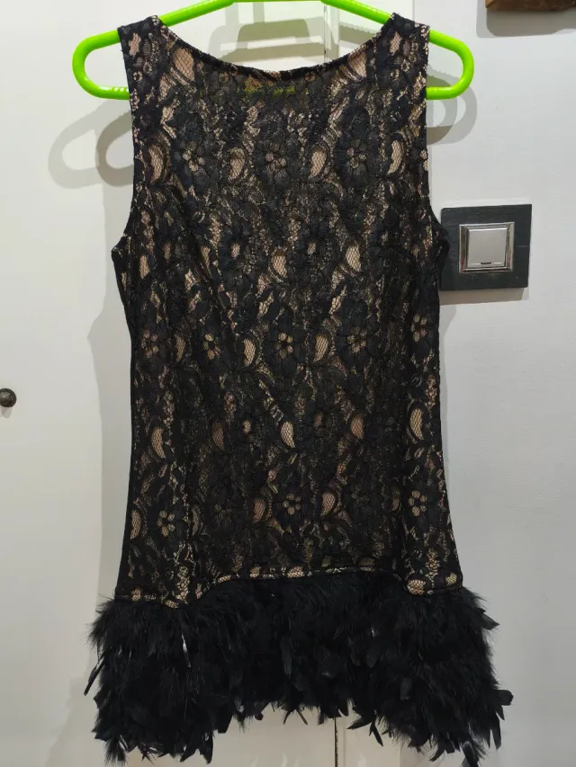 Vestido fiesta encaje y plumas negro