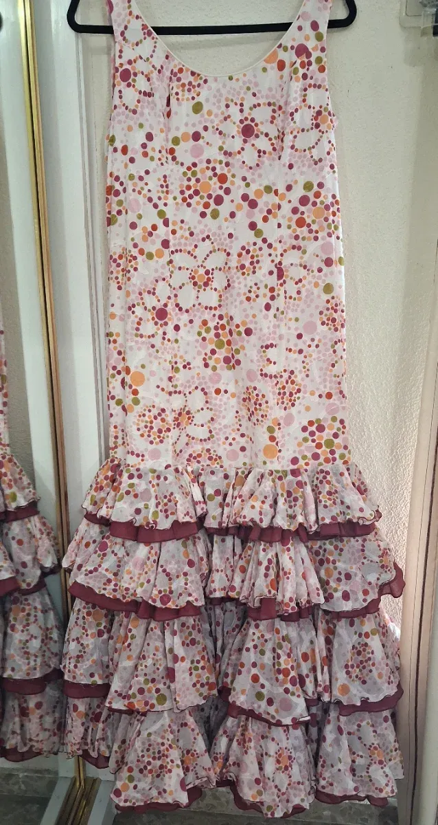 Vestido de flamenca, gitana o rociero con un estampado vibrante y alegre. Medidas en imagenes. Tiene bolsillos y como 2 cms para sacar en cintura y cadera