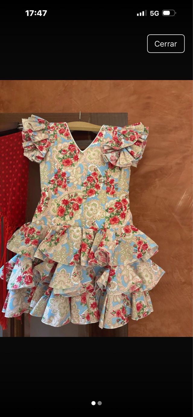 Vestido de flamenca para niña, talla 4 años. Con un bonito estampado floral. - Mangas con volantes. - Cuerpo con escote en V. - Falda con varios volantes.