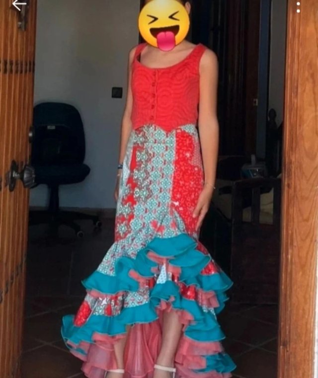 - Falda larga con volantes en turquesa y rojo.