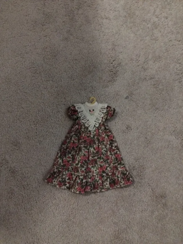 Vestido de estilo clásico con estampado floral y detalles de encaje. - Mangas cortas abullonadas. - Cuello con puntilla. - Falda con volantes.