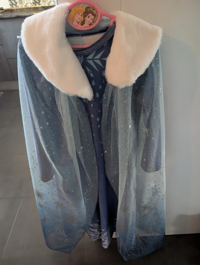 Vestido de Frozen con capa de tul brillante. - Diseño inspirado en Elsa. - Cuello de pelo sintético blanco. - Estampado de copos de nieve y detalles plateados.