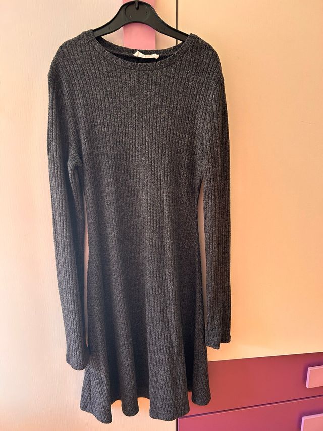 Vestido de punto gris con manga larga. - Talla 11/12 años. - Diseño de canalé. - Corte acampanado.