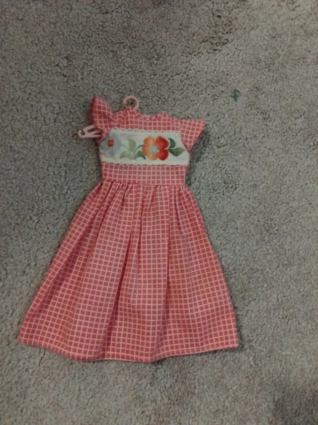 Vestido de tela con estampado de cuadros pequeños en tono coral y detalle bordado de flores en el pecho. - Diseño con manga corta.