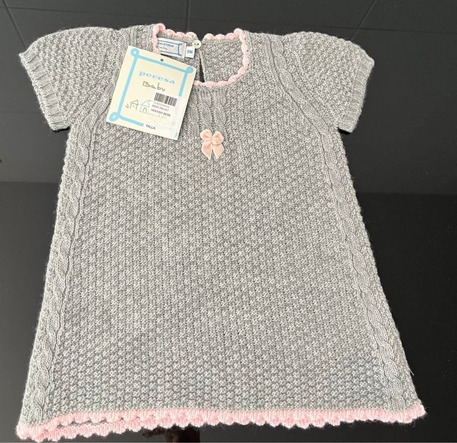 Vestido de lana para bebé, ideal para los meses más fríos. - Color gris con detalles en rosa. - Adorno de lazo. - Tejido de punto. - Talla 9 meses.