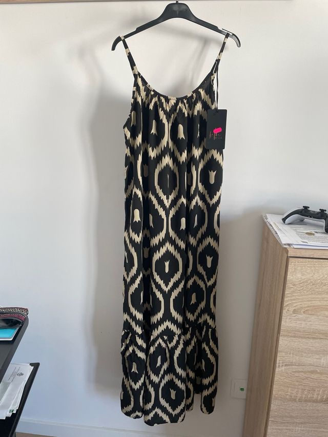 Vestido largo estampado beige y negro