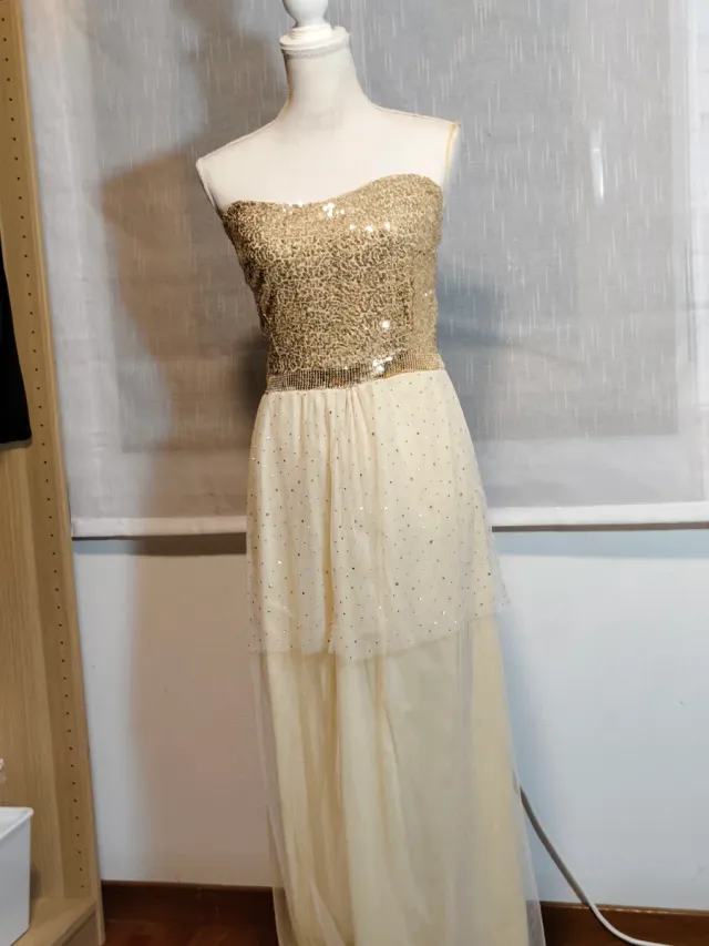 Vestido largo lentejuelas y gasa sin tirantes