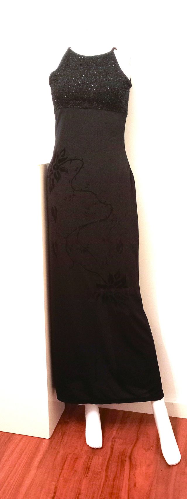 Vestido largo negro elástico bordado y busto brill