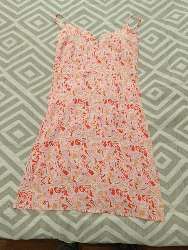 Vestido de tirantes con un bonito estampado floral en tonos rosas y naranjas. Ideal para el verano.