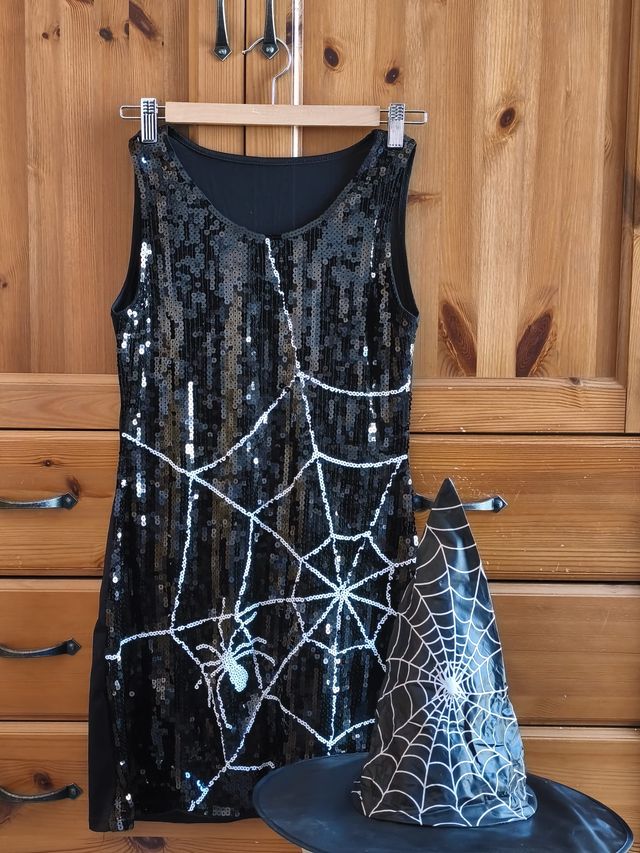 Vestido lentejuelas telaraña y sombrero Halloween