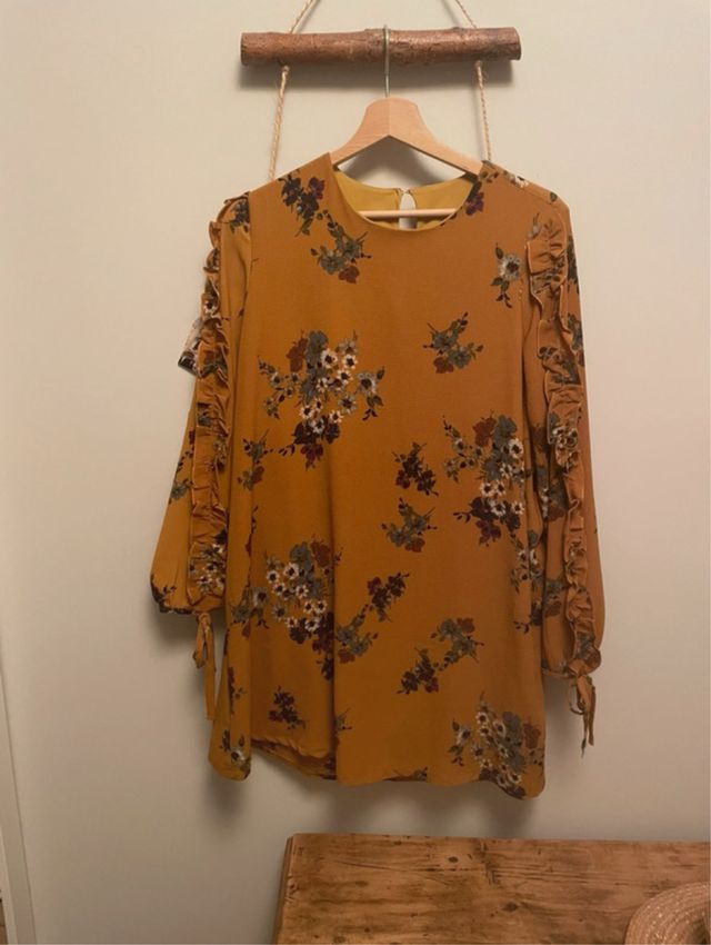 Vestido Mostaza Floral Mangas Volantes