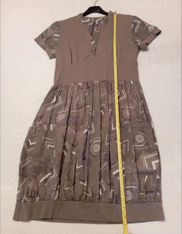 Vestido manga corta, mangas y falda de tela estampada en tonos blancos, lilas, grises...con 2 bolsillos a los lados, estilo algo abullonado; cuerpo de algodón que estira y se adapta al cuerpo por que es tela de punto (como de camiseta), por lo que las medidas de las fotos son orientativas, da talla L o incluso XL porque el cuerpo estira de ancho.