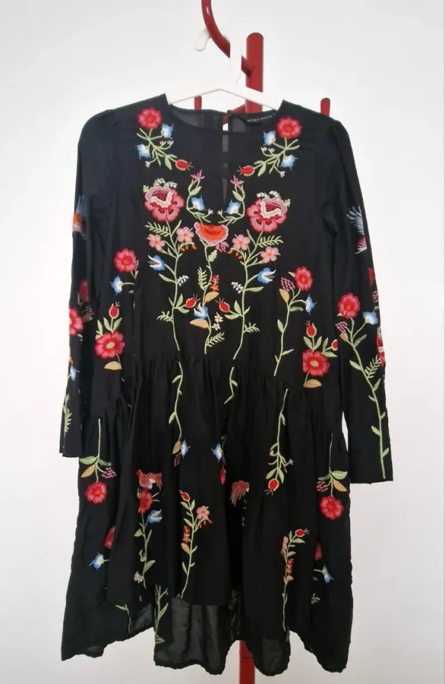 Vestido negro con un bonito bordado floral multicolor.