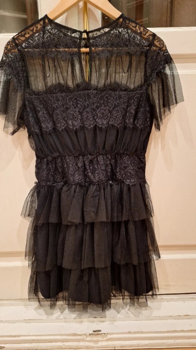 Vestido corto de tul negro con detalles de encaje y volantes.